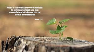 JESAJA 11 Verse 1 tot 10: “MAAR daar sal ‘n takkie uitspruit uit die stomp van Ísai, en ‘n loot uit sy wortels sal vrugte dra; en op Hom sal die Gees van die Here rus, die Gees van wysheid en verstand, die Gees van raad en sterkte, die Gees van kennis en van die vrees van die Here…”.