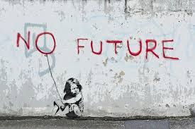 Op ‘n ou muur was met graffiti geskryf die woorde “no future” – geen toekoms. Dit is ‘n kreet uit die Engelse punkbeweging “no future.” Maar Banksy het daarby iets bygevoeg. Van die “o” het hy met ‘n paar eenvoudige lyne ‘n ballon gemaak wat deur ‘n meisie vasgehou word. Speelse effek… en terselfdertyd lyk die meisie nie gelukkig nie. Hierdie beeld roep ‘n dieper oorweging op: wil die kunstenaar die neerdrukkende boodskap van die graffiti sagter gemaak ge-ontkrag, of versterk hy met sy toevoeging juis die indringende werking? Die meisie met die ballon simboliseer dalk ‘n sprankie hoop te midde van wanhoop, ‘n brose poging om vas te hou aan iets mooi in ‘n skynbaar hopelose situasie.