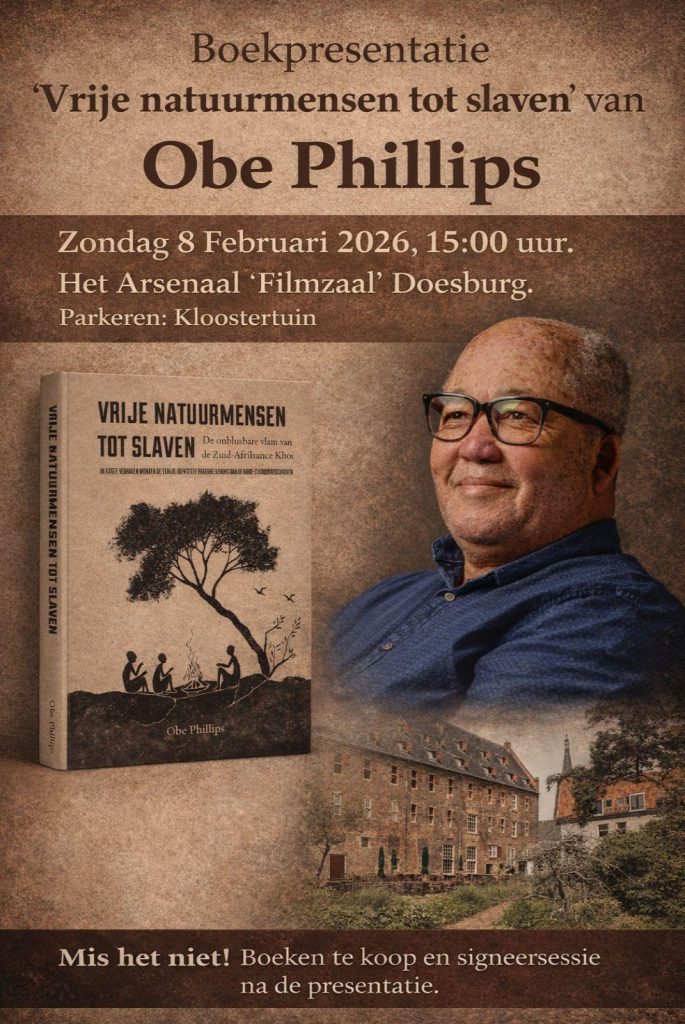 Op zondag 8 februari 2026 nodig ik je van harte uit in Doesburg voor de boekpresentatie van mijn debuut ‘Vrije natuurmensen tot slaven’. In Het Arsenaal – Filmzaal vertel ik om 15:00 uur het verhaal achter dit boek, gevolgd door een Q&A. Daarna is er alle ruimte om elkaar te ontmoeten tijdens koffie/thee en Zuid-Afrikaanse melktaart, en kun je het boek kopen en laten signeren.