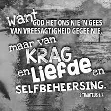 2 Timoteus 1 vers 7: God het die Heilige Gees vir ons gegee, en daarom is ons nie bang nie. Nee, die Heilige Gees maak ons sterk en help ons om lief te wees vir mense en om reg te besluit wat ons moet doen