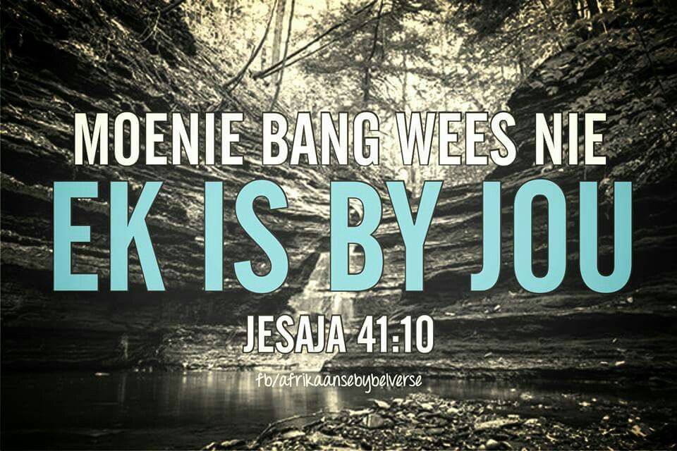 JESAJA 41:10: “Wees nie bang nie, want Ek is met jou; moenie vrees nie, want Ek is jou God. Ek sal jou versterk, Ek sal jou help, Ek sal jou ondersteun met my oorwinnende regterhand.”