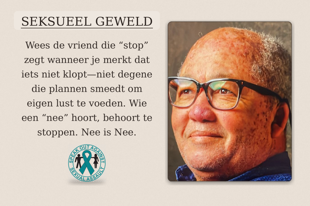 Bescherm jezelf en anderen met wijsheid. Schep geen verborgen situaties waarin grenzen kunnen worden overschreden. Wees voorzichtig met “privécontact” dat zich onttrekt aan verantwoording. Wees de vriend die “stop” zegt wanneer je merkt dat iets niet klopt—niet degene die plannen smeedt om eigen lust te voeden. Wie een “nee” hoort, behoort te stoppen. Nee is Nee.