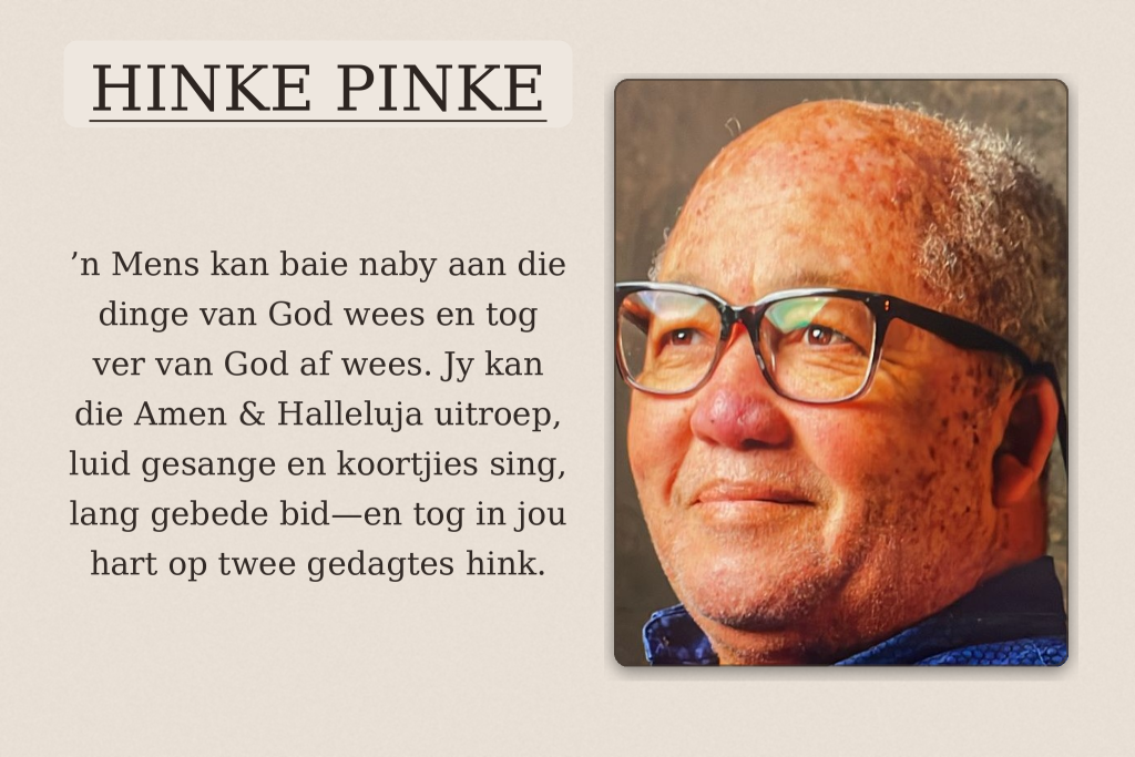 Blogleser, ’n Mens kan baie naby aan die dinge van God wees en tog ver van God af wees. Jy kan die Amen & Halleluja uitroep, die gesange en koortjies sing, lang gebede bid—en tog in jou hart op twee gedagtes hink. Dit is waarom ons tema so belangrik is: hink beteken nie net onsekerheid nie; dit is verdeelde aanbidding. Dit is wanneer ek nog godsdienstig lyk, maar nie werklik oorgegee leef nie.