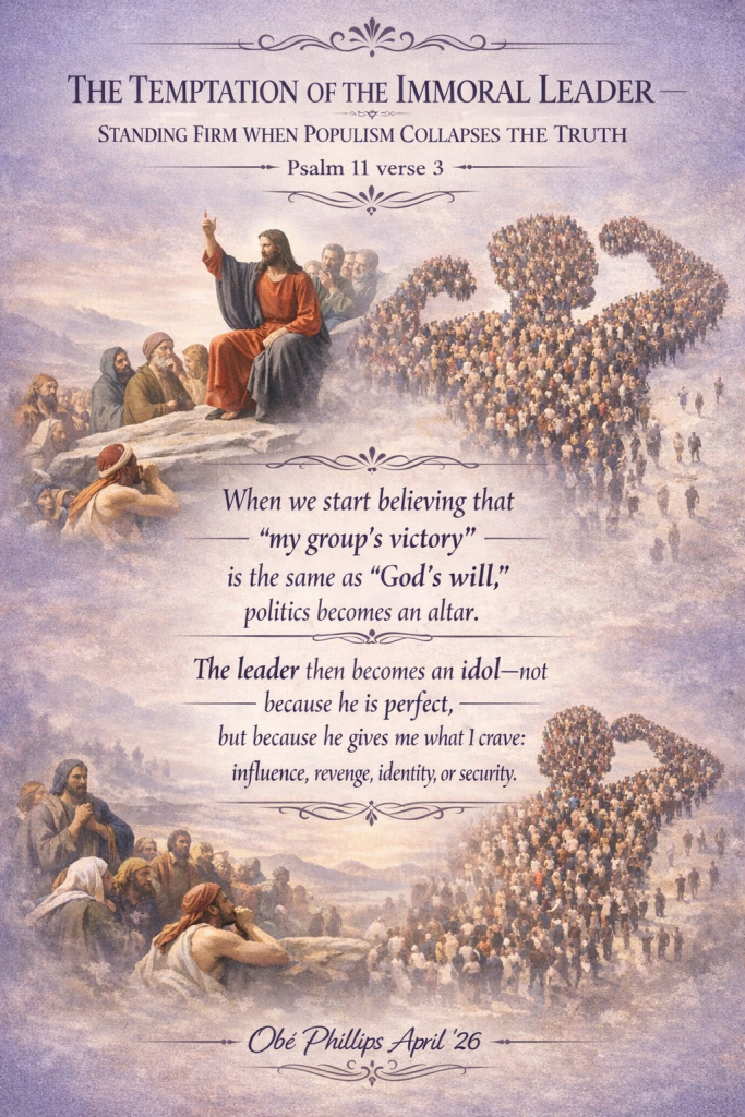 It is painful to see how many believers tie themselves to leaders whose private lives openly clash with the gospel of Christ. There is a trend where people are willing to overlook immorality, roughness, arrogance, and even hateful speechโas long as that leader promises to fulfil our political wishes or protect our social power. That is a dangerous trade: we give up our moral authority in exchange for a seat at the table of power. Scripture warns us not to put our trust in people. When the church makes peace with injustice because it fits our story of โwinning,โ we lose our saltiness. This Faustian bargainโpower in exchange for integrityโpoisons the soul of a community. Jesus did not come to grab the political power structures of His day, but to establish a kingdom of love and truth that calls the powerful to account.