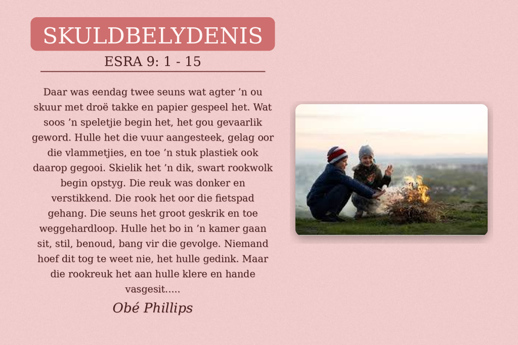 Bloglesers, die boodskap is eenvoudig, maar betekenisvol: as jy bely, word skuld vergewe. Nie omdat belydenis op sigself verdienstelik is nie, maar omdat God genadig is in Jesus Christus. Soos die seuns by die vuur moes erken wat gebeur het voordat daar vrede kon kom, so vra die Here dat ons nie met rook in ons harte moet rondloop nie. Hy wil hê ons moet na Hom toe kom. Nie môre nie. Nou.