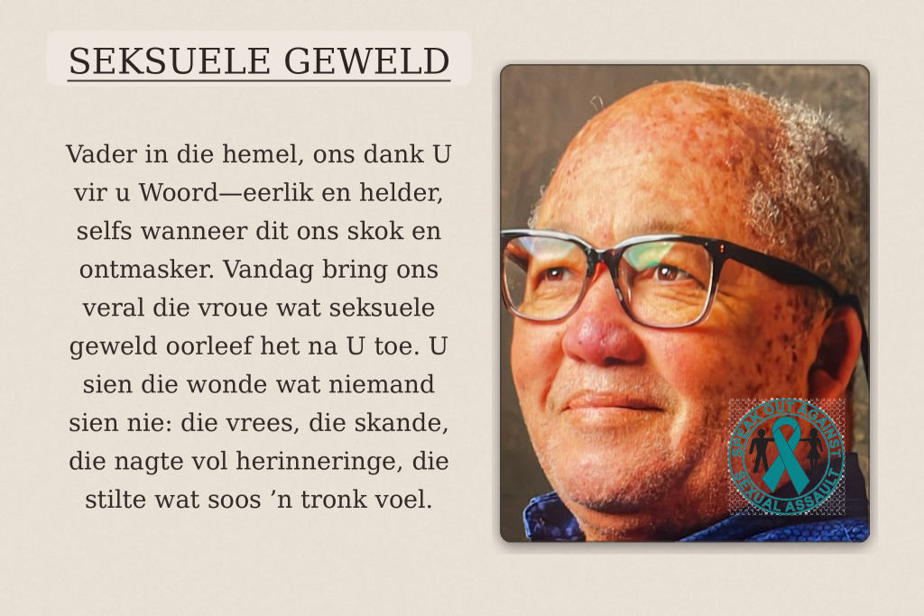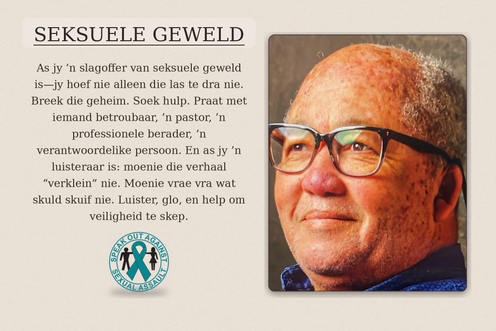 As jy ’n slagoffer van seksuele geweld is—jy hoef nie alleen die las te dra nie. Breek die geheim. Soek hulp. Praat met iemand betroubaar, ’n pastor, ’n professionele berader, ’n verantwoordelike persoon. En as jy ’n luisteraar is: moenie die verhaal “verklein” nie. Moenie vrae vra wat skuld skuif nie. Luister, glo, en help om veiligheid te skep.