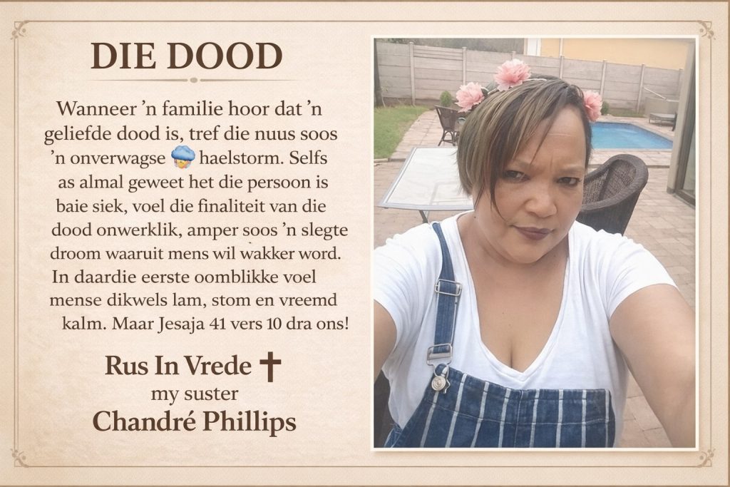 Baie Dankie OB. Ons kyk na Hom wat die dood oorwin het. Baie Dankie vir die Trooswoord. Mag die Woord ook vir OB en die familie troos. Geseen Ds OB Phillips Michael/Julia Swaer.